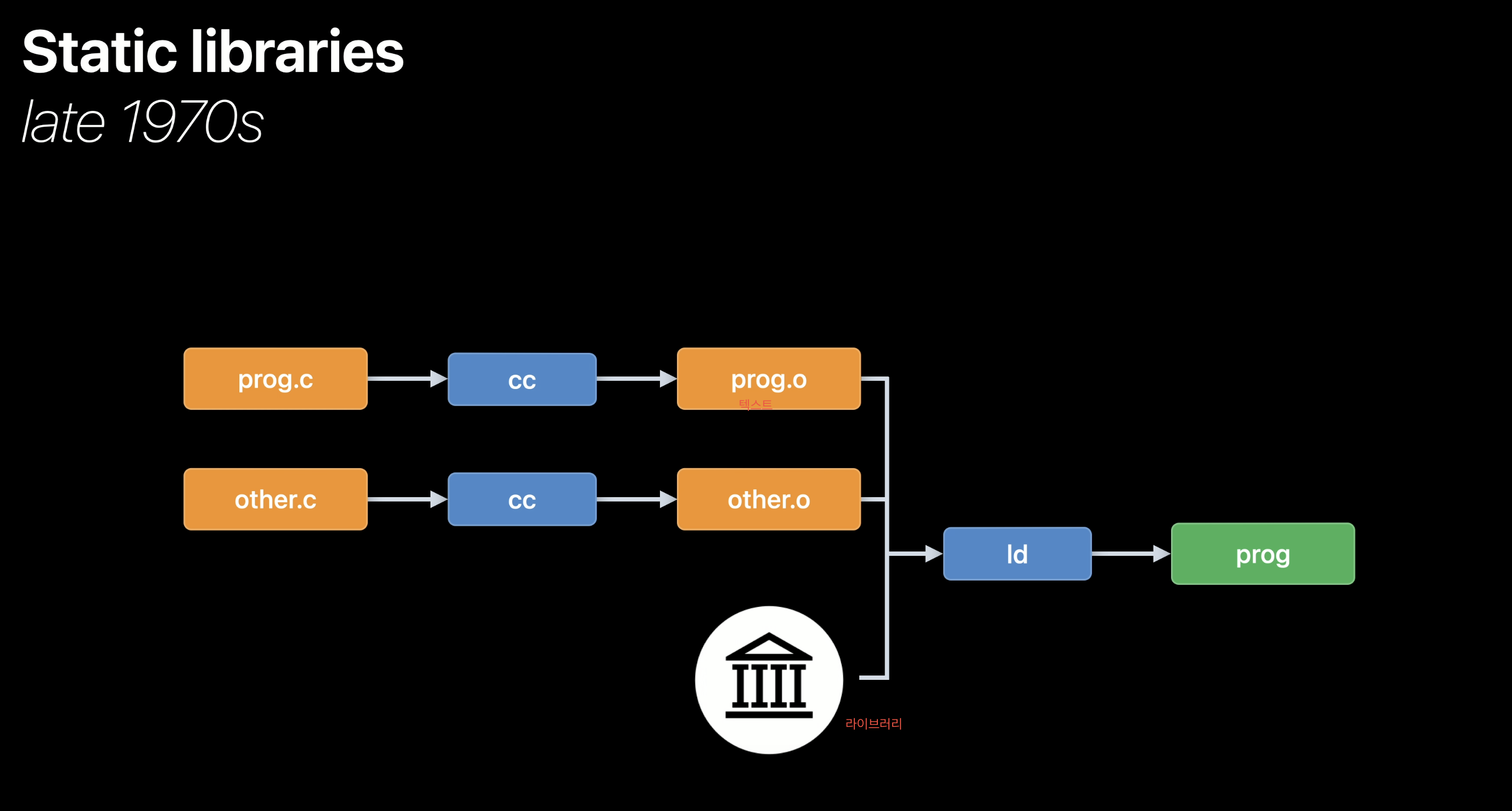 ์๋ฅผ ๋ค์ด, C ํ์ค ๋ผ์ด๋ธ๋ฌ๋ฆฌ ํจ์๊ฐ ๋ชจ๋ ํฌํจ๋ libc.a๊ฐ ๋ง๋ค์ด์ก์ต๋๋ค.