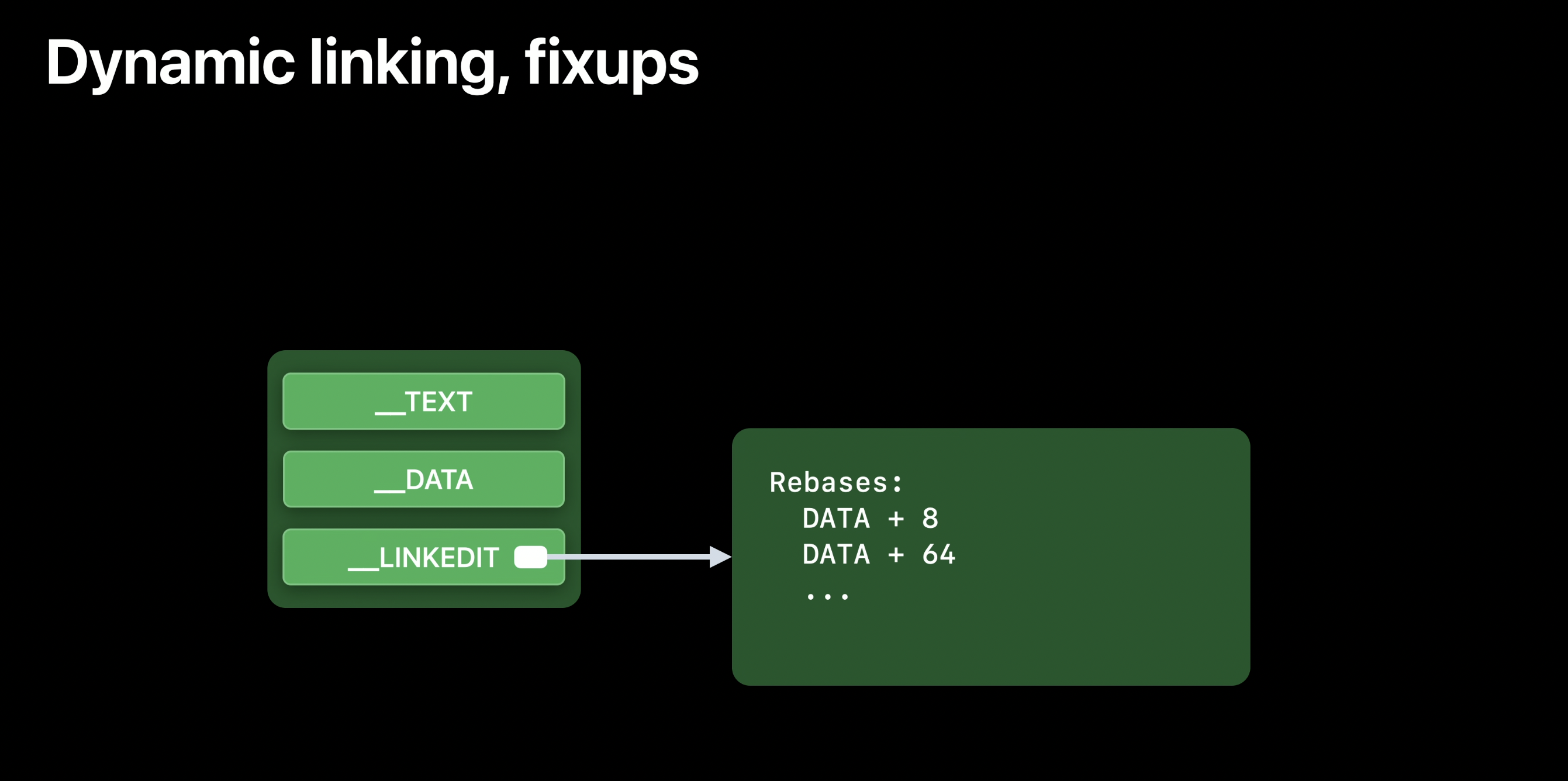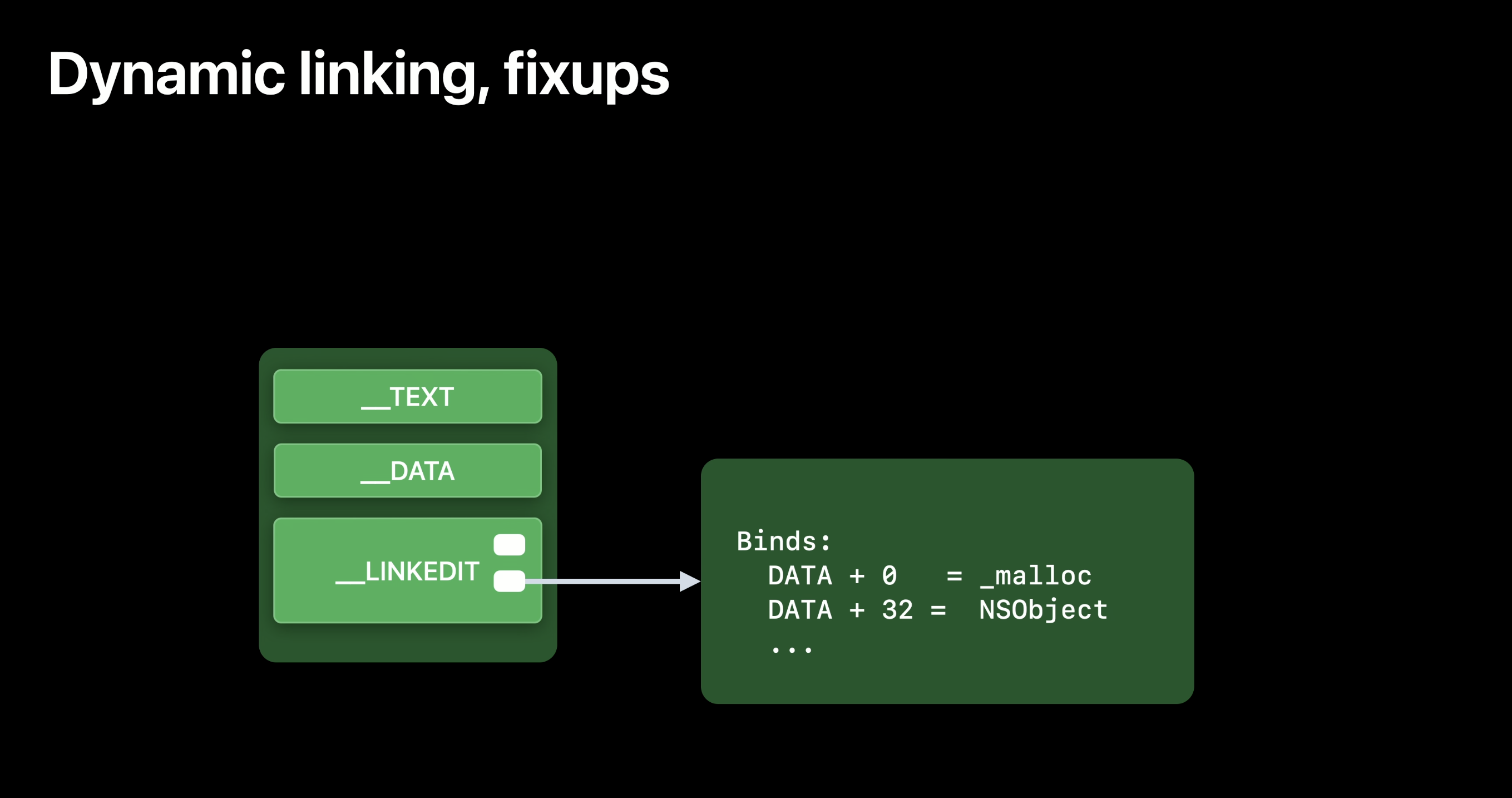 ๊ทธ๋ฌ๋ ๋จ์ํ ๋งคํํ๋ ๊ฒ๋ง์ผ๋ก๋ ์ถฉ๋ถํ์ง ์์ต๋๋ค. ํ๋ก๊ทธ๋จ์ด dylib์ "์ฐ๊ฒฐ"๋๊ฑฐ๋ ๊ฒฐํฉ๋์ด์ผ ํฉ๋๋ค. ์ด๋ฅผ ์ํด "์์ (fix-ups)"์ด๋ผ๋ ๊ฐ๋ ์ด ๋์ ๋ฉ๋๋ค.